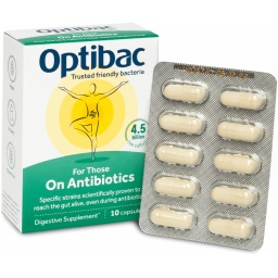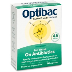 OptiBac For those on antibiotics. 10 daga skammtur með sýklalyfjakúr. Inniheldur 3 milljarða af virkum gerlum sem þola að vera teknir samhliða sýklalyfjum. Kemur í veg fyrir aukaverkanir s.s. niðurgang og sveppasýkingu.